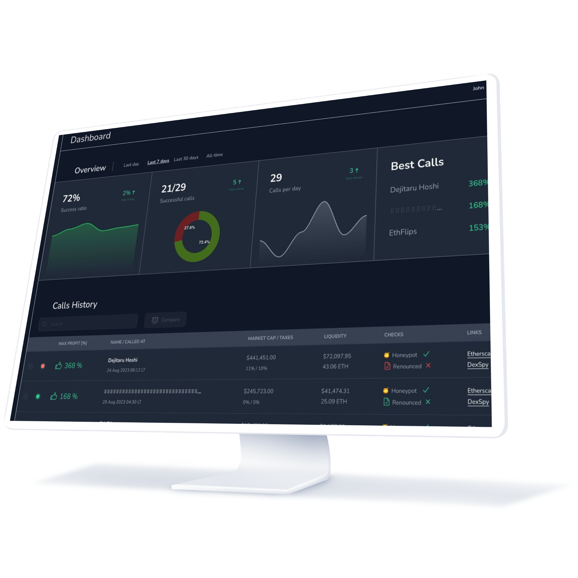 Our transparent custom dashboard showcases previous signals,